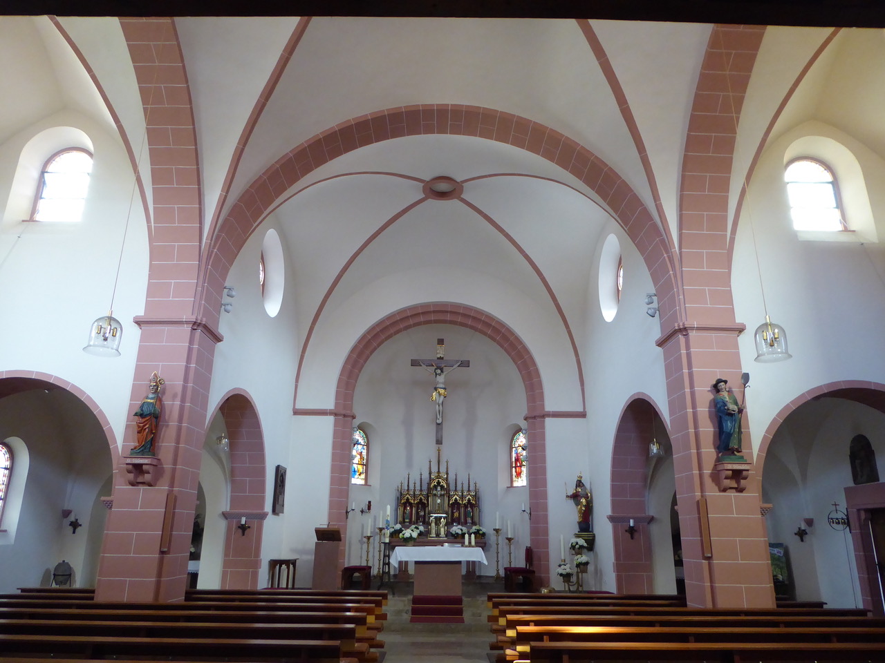Das Gotteshaus wurde im neuromanischen Stil an den historischen Turm angebaut. Weil der Platz begrenzt war, zeigt der Altarraum ausnahmsweise nach Norden – Gott hört Gebete schließlich aus jeder Himmelsrichtung.