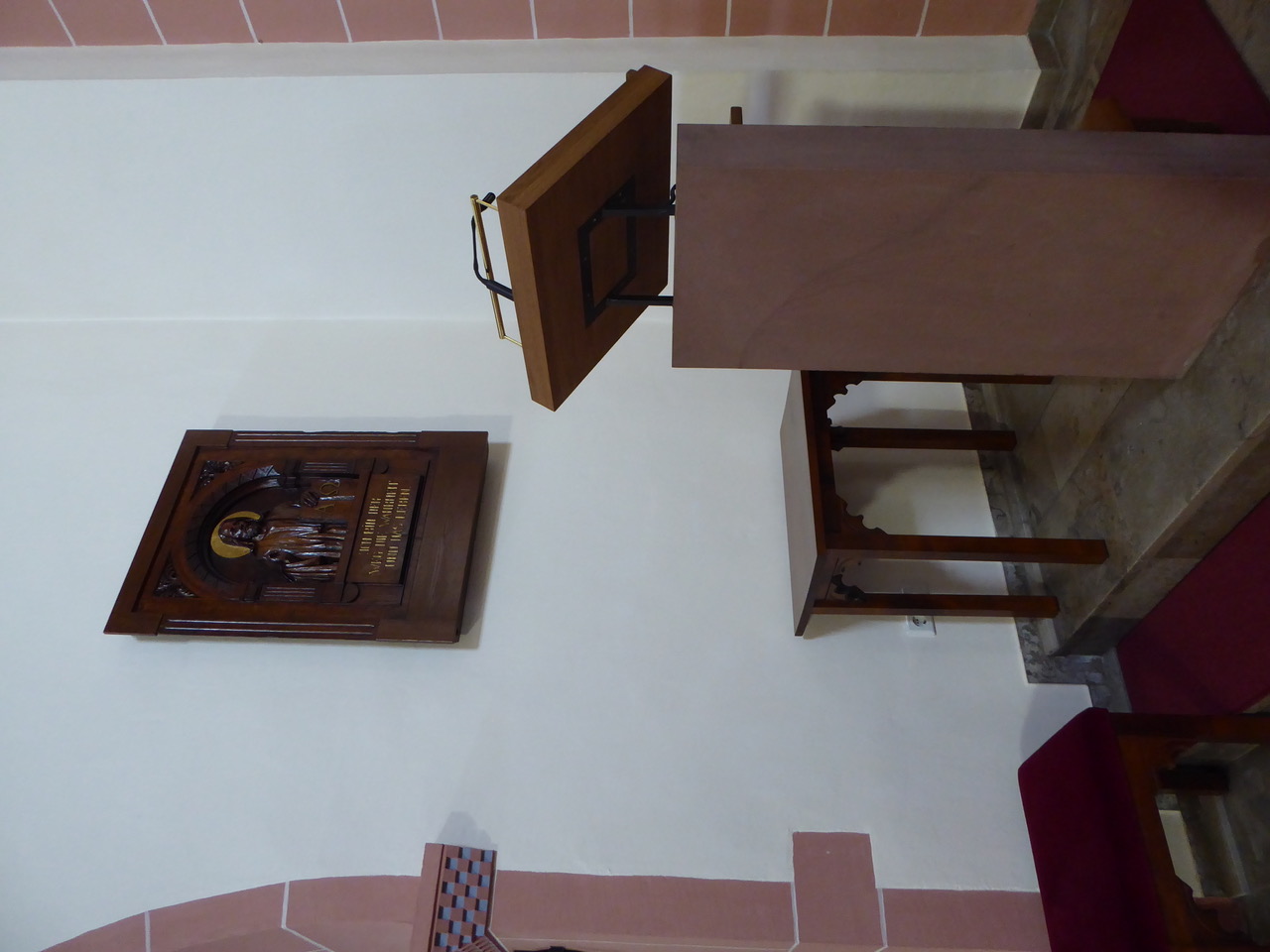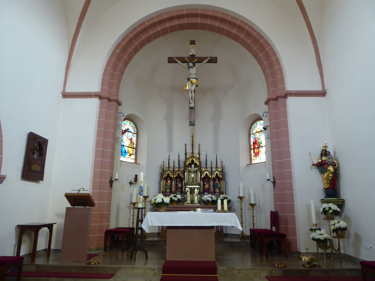 Als Tischplatte in der Altarnische dient die steinerne Stele, die auf dem Friedhof zum Gefallenengedenken aufgestellt war und in 1966 durch eine Bronzetafel ersetzt wurde.