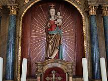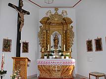 Im Innenraum mit flacher Holzdecke steht ein kleiner holzgeschnitzter Barockaltar mit einer Holzplastik der gekrönten Gottesmutter mit Kind und Zepter.