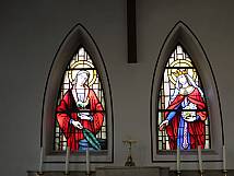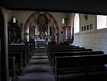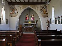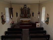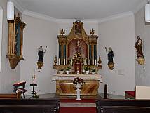 An der linken Innenwand der Vorhalle hat ein Kriegerdenkmal unter dem Bild der Schmerzhaften Mutter Maria einen guten Platz gefunden. Der Innenraum hat eine Holzbalkendecke und einen spitzen Chorbogen, seitlich davon Fresken mit anbetenden Engeln und Auge Gottes. Im Altarraum sehen wir zwei Farbglasfenster mit St. Vitus und St. Elisabeth. Über dem steinernen Tischaltar mit einfachem Tabernakel befindet sich ein Standkreuz. Seit der letzten Renovierung 1986 besitzt die Kirche einen neuen Zelebrationsaltar.