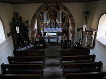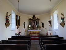 Der Innenraum hat eine flache Holzbalkendecke und einen spitzen Chorbogen. Der holzgeschnitzte barocke Hauptaltar zeigt zwischen korinthischen Säulen ein Altarblatt mit der Gottesmutter und dem Jesuskind, umgeben von den Vierzehn Nothelfern (um 1700).