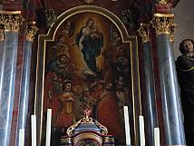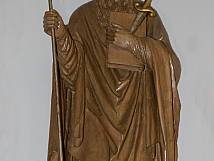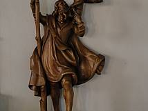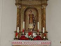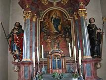 Seitlich stehen auf Konsolen große Holzplastiken des hl. Apostels Jakobus des Älteren und eines Benediktiner Abtes. Eine Kostbarkeit ist der barocke kleine Seitenaltar mit Holzplastiken der Vierzehn Nothelfer. An der rechten Seite befindet sich der Korb einer barocken Kanzel. Die Kirche birgt noch eine spätgotische Holzplastik der hl. Mutter Anna um 1500. Unter der Empore steht ein Kastenbeichtstuhl.
