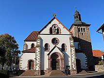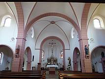 Die Kirche ist im neuromanischen Stil an den Turm angebaut. Der Altarraum zeigt nach Norden, da eine Ausrichtung nach Osten aus Platzgründen nicht möglich war. Die 4 starken Vierungspfeiler stehen auf den Fundamenten der alten Kirche und tragen den dreischiffigen Innenraum. Dieser Innenraum hat im Laufe der Zeit manche Veränderung erfahren. So wurde im Altarraum nach ausdrucksstarker ornamentaler Ausmalung mit Christkönigsbildnis (1927) und dem Motiv der Dreifaltigkeit (1949) schließlich nach dem Konzil auf farbliche Betonung verzichtet. Den Hochaltar schmückt ein neugotischer Aufsatz mit vier Heiligenfiguren. Über dem Zelebrationstisch ist ein Holzkreuz mit Christuskorpus angebracht, die beide weit über 300 Jahre alt sind. Das Holzrelief seitlich vom Ambo war Teil der früheren Kanzel.