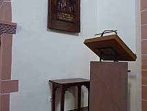 Als Tischplatte in der Altarnische dient die steinerne Stele, die auf dem Friedhof zum Gefallenengedenken aufgestellt war und in 1966 durch eine Bronzetafel ersetzt wurde.