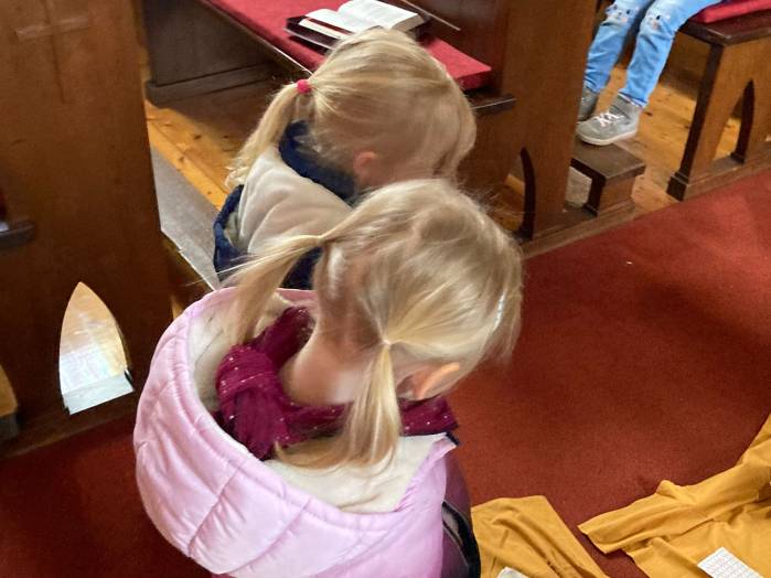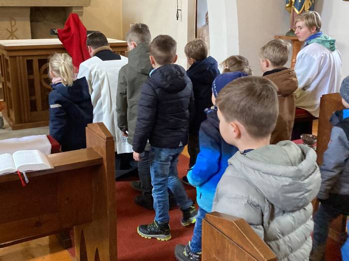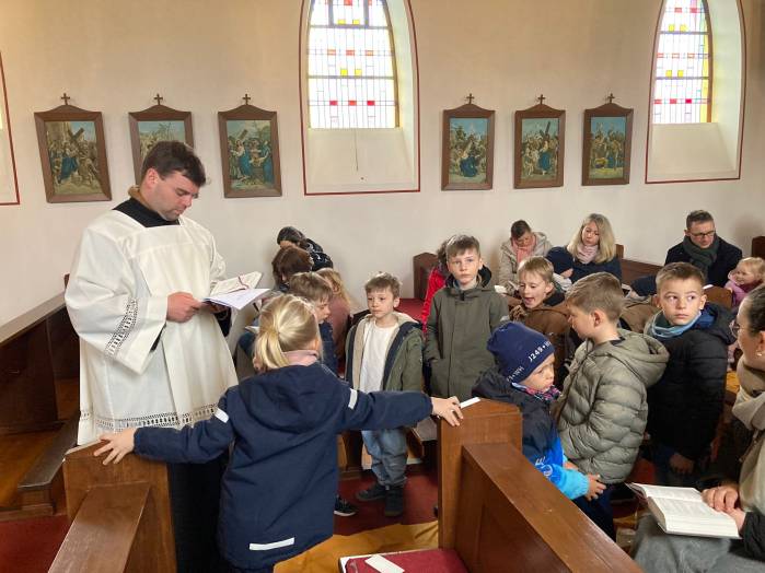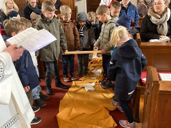 Am Karfreitag gedenkt die Kirche des Leidens und Sterbens Christi. Seit drei Jahren findet anlässlich dieses traurigen Tages in der kleinen Kirche in Lütterz ein Familienkreuzweg statt. Dieser wurde von zahlreichen Kindern aus Lütterz und Bimbach besucht. Während die ernsteren Texte aus dem Gesangbuch die anwesenden Erwachsenen auf das Geschehnis des Karfreitags einstimmen sollten, durften die Kinder im Mittelgang der Kirche den Leidensweg Jesu mit allerlei Materialien und Symbolen erleben. An jeder Station erklärte Gemeindereferent Silbermann, anschaulich was mit Jesus passiert ist. Zu Beginn des Kreuzweges wuschen die teilnehmenden Kinder ihre Hände in Unschuldig und erinnerten sich dabei an Pontius Pilatus und sein feiges Todesurteil. Anschließend trugen die Kinder das Kreuz gemeinsam. Die etwas mutigeren Kinder durften an der zwölften Station 4 Nägel in ein Kreuz hämmern oder an der vierzehnten Station Jesus in ein weißes Tuch einwickeln und auf dem leeren Hochaltar vor dem Tabernakel beerdigen.