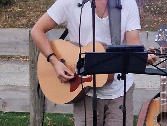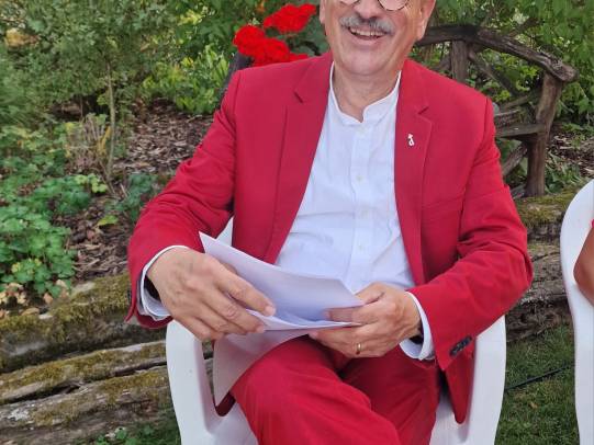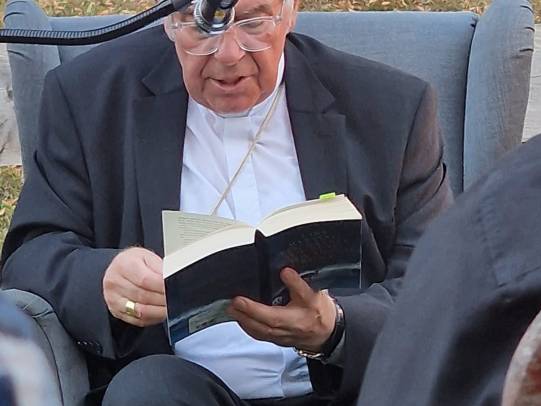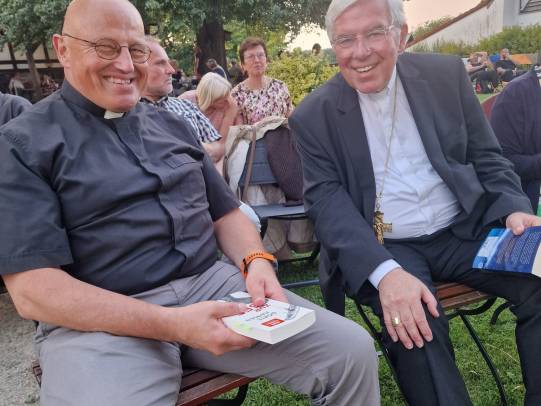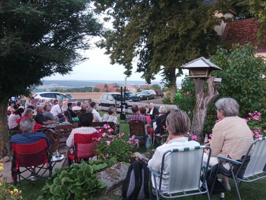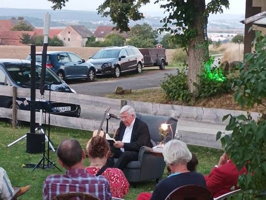 Im Biergarten liefen bereits die letzten Vorbereitungen für die anschließende „Literatur am Kirchplatz“. Musiker Johannes Michel stimmte mit seiner Gitarre und einer wundervollen klaren Stimme sommerliche Klänge an. Schließlich eröffnete Diakon Michael Friedrich als Moderator den Abend und begrüßte die Lektoren des Abends: Weihbischof Diez, Dr. Rupp, Pfarrer Hartel und Bürgermeister Fritzsch. Alle vier lasen im Laufe der nächsten zweieinhalb Stunden jeweils etwa zwanzig Minuten aus ihren Sommerlektüren vor. Unterbrochen wurden die Lesungen durch musikalische Stücke, die passend zu den Lesetexten ausgesucht worden waren.