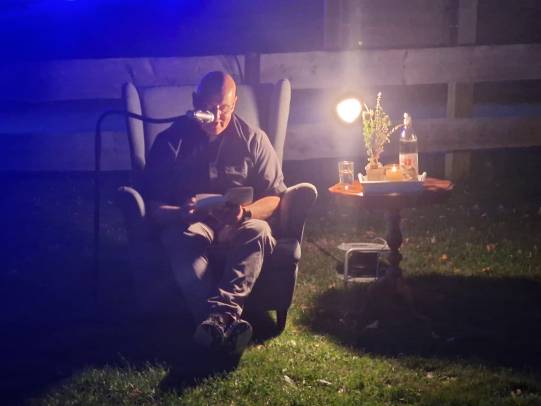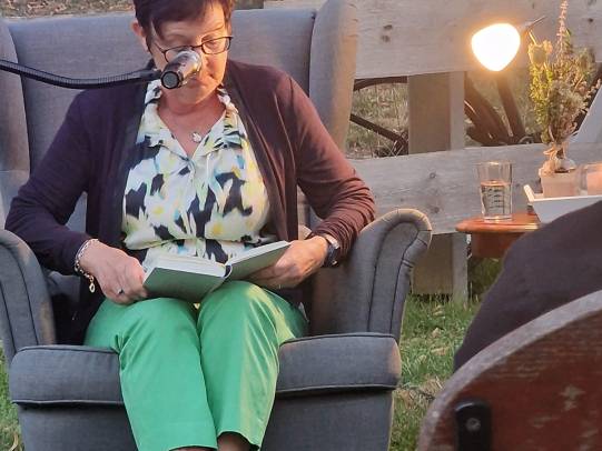 Nach und nach wurde es dunkel um die zahlreichen Zuhörer. Der schein der bunten Strahler tauchte die Schnepfenkapelle in ein leichtes blaues Licht. Die Lektoren saßen auf einem gemütlichen Ohrensessel, welcher durch den Schein einer Nachtischlampe erleuchtet wurde. So verging die Zeit wie im Flug. Weit nach zehn Uhr verabschiedete Diakon Friedrich die Gäste und alle Zuhörer, in der Hoffnung, dass das besondere Ambiente der Schnepfenkapelle noch einmal Ort für die „Literatur am Kirchplatz“ sein wird.