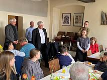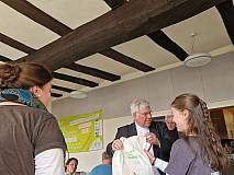 Weihbischof Karlheinz Diez, Bürgermeister Peter Malolepszy und Ortsvorsteher Hubert Krah statteten den Jugendlichen einen Besuch ab, informierten sich über die Projekte und bedankten sich für den vorbildlichen Einsatz für das Gemeinwohl. Nach einem kurzen Impuls von Weihbischof Karlheinz Diez, trugen die Jugendlichen passend zu den Aktionstagen ihre Fürbitten vor. Leo Faulstich (Trompete) und Jannis Allgeyer (Tenorhorn) begeisterten die Zuhörerinnen und Zuhörer mit dem Lied „Ode an die Freude“.
