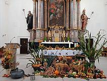 Festlich geschmückter Erntedankaltar.