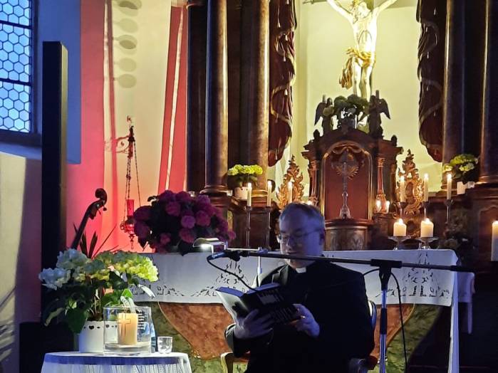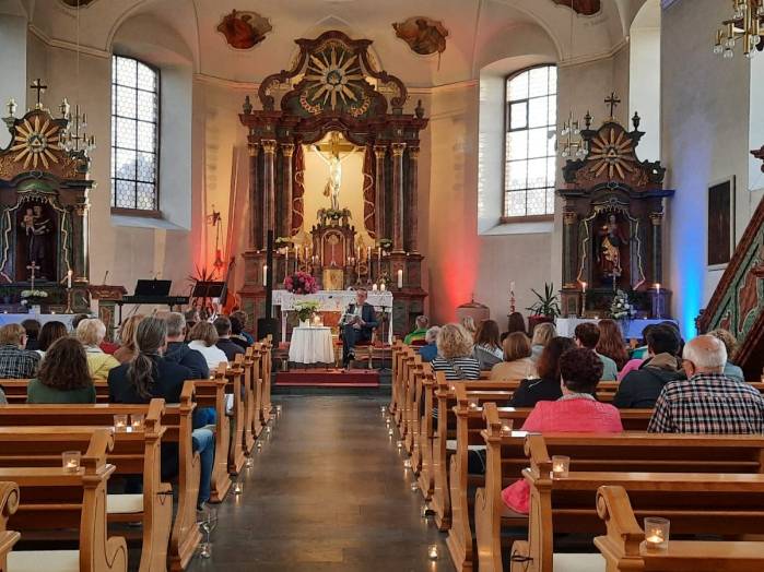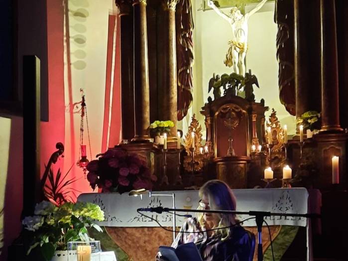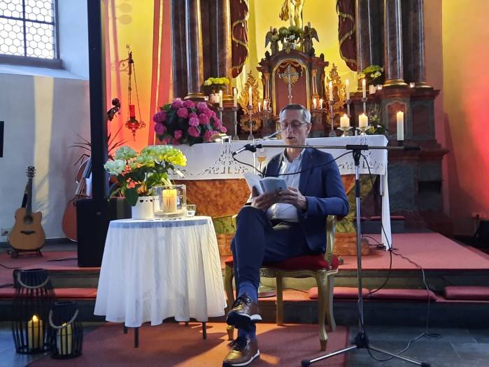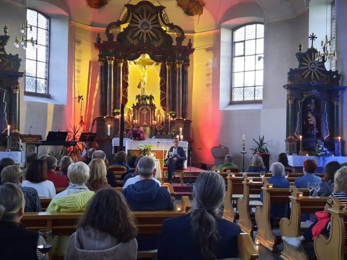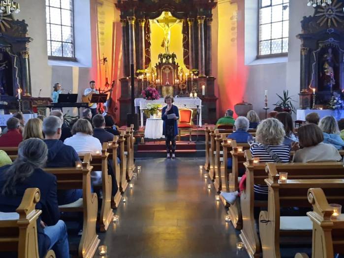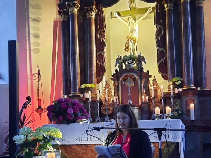 „Spuren der Religion in zeitgenössischer Literatur“ ist das Motto der Reihe „Literatur am Kirchplatz“. Am Freitag, dem 21. Juni kamen etwa 50 Besucher zur Lesung in die Pfarrkirche in Hosenfeld. Wegen des Wetters konnte die Veranstaltung nicht im Freien stattfinden. Mit dem Worship-song „Unter seinem Schirm“ von Samuel Harfst eröffneten Viktoria Blumenthal (Gesang, Klavier) und Lukas Streitenberger (Gesang, Gitarre, Kontrabaß), die den musikalischen Teil übernommen hatten, den Abend. Danach konnte Moderatorin Siegrid Erb den ersten Leser ankündigen. Bürgermeister Peter Malolepszy las aus Ewald Arenz Buch: „Der große Sommer.“ Ihm folgte die Leiterin der Vogelsbergschule Hosenfeld, Karin Meyer-Badenhop mit Passagen aus Raynor Winns Buch „Der Salzpfad.“ Auszüge aus „Das Lichtspiel“ von Daniel Kehlmann brachte Offizial Till Hünermund zu Gehör. Abgeschlossen wurde die Lesung durch die Verwaltungsleiterin im Pastoralverbund Kleinheiligkreuz, Simone Kohlmann, mit einigen Seiten aus dem Werk „Mein Leben mit Martha“ von Martina Bergmann. Musikalisch durften sich die Gäste noch an weitere Songs erfreuen, unter anderem an „When you say nothing at all“ von Roan Keating, „Leichtes Gepäck“ von Silbermond und „Die Reise“