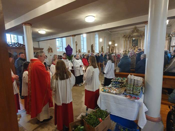 Das Ergebnis am Ende konnte sich durchaus sehen lassen. Nach gerade einmal zwei Stunden waren 350 Palmsträußchen und über 400 Ostereier bereit für den Verkauf in der Kirche und im Hofladen der Familie Stock. Vor dem Verkauf der Palmsträußchen, wurden diese noch in einem feierlichen Gottesdienst am Samstagabend gesegnet. Die Palmsträußchen erinnern dabei an den feierlichen Einzug Jesu in Jerusalem.