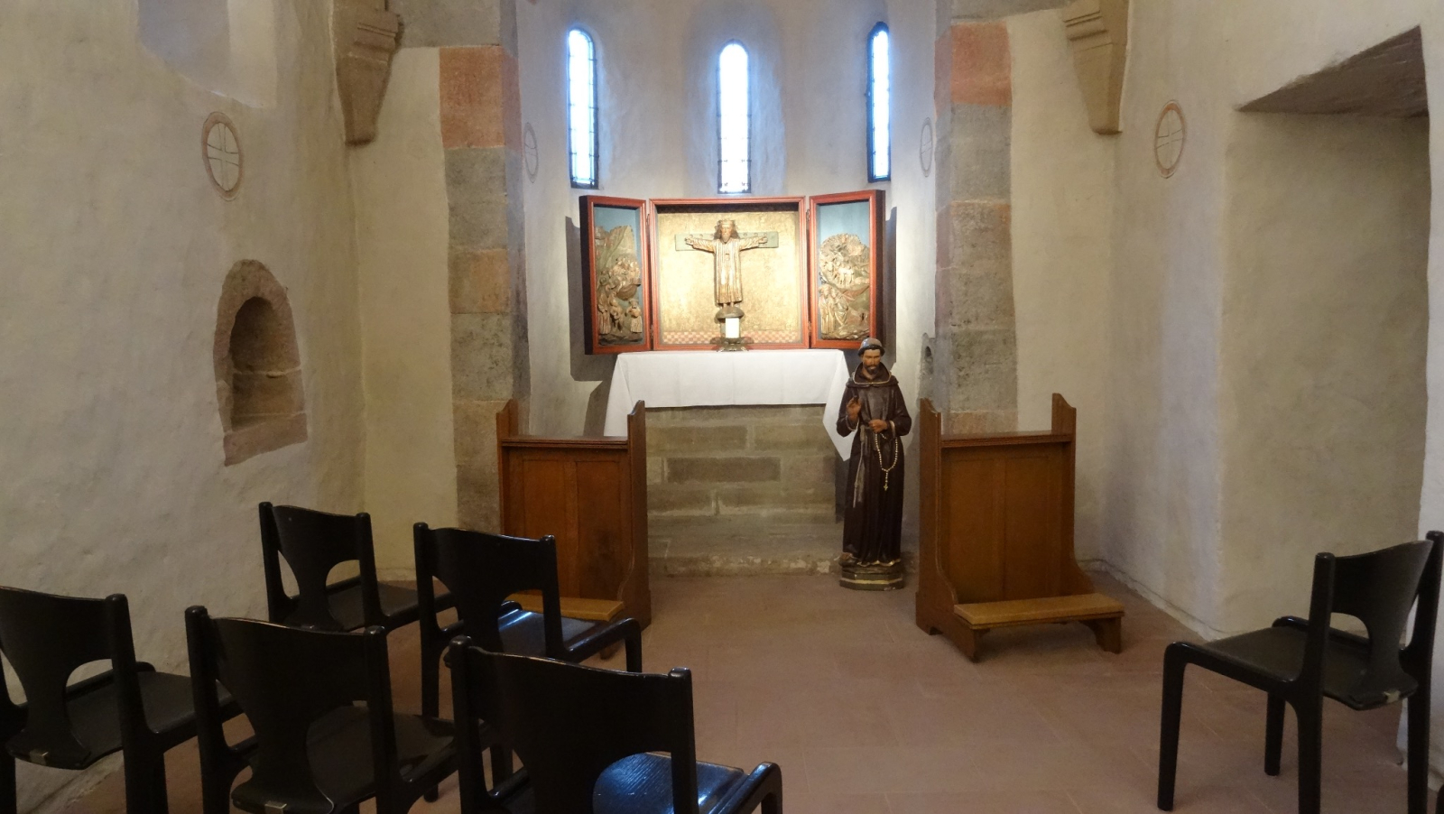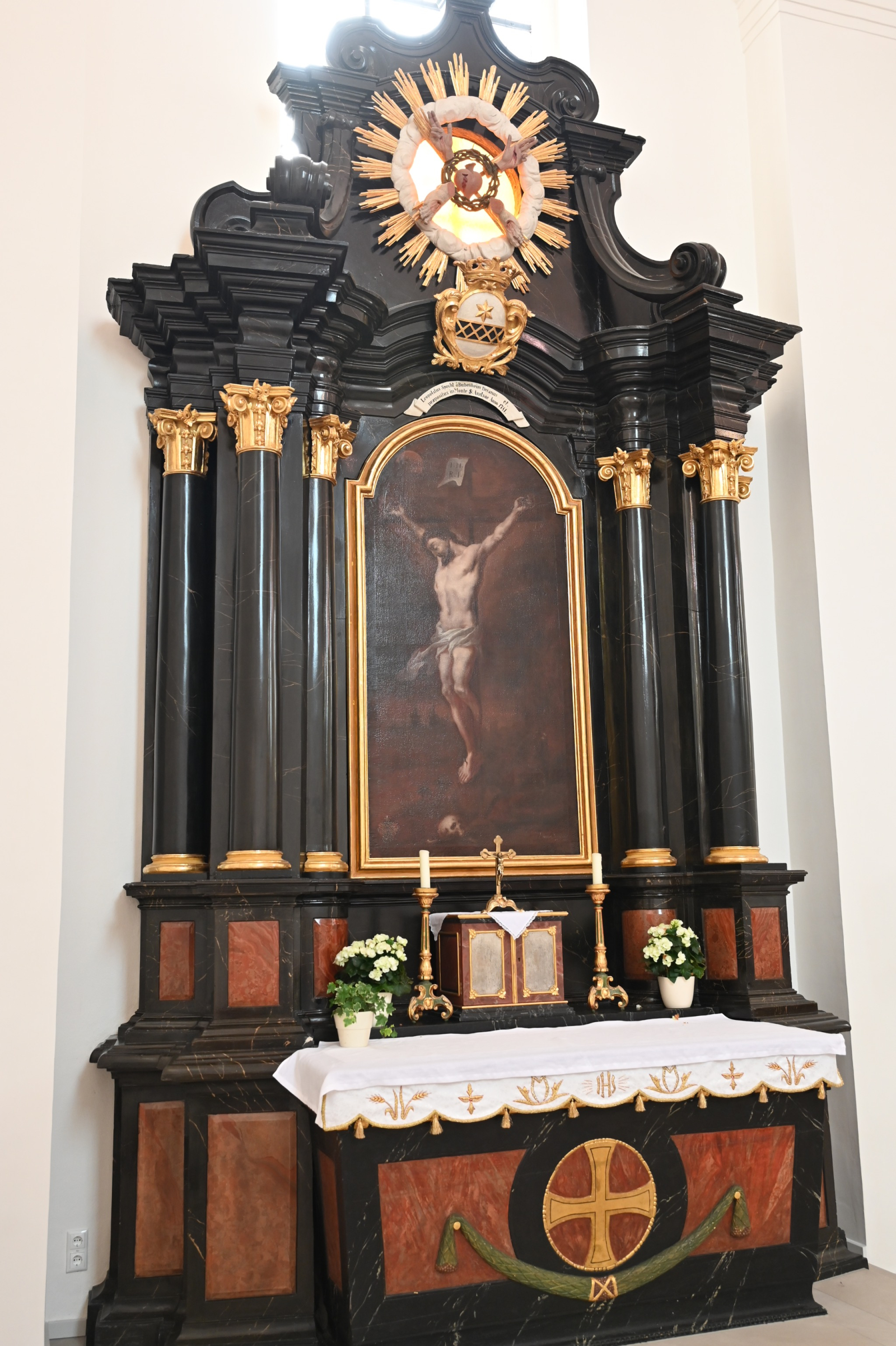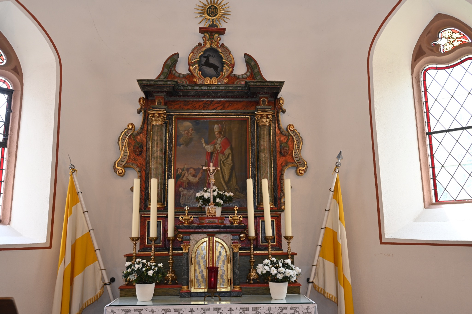 In der Apsis steht ein kleiner spätgotischer Flügelaltar, in seiner Mitte ein bekleideter und gekrönter Christus am Kreuz mit Reliquienöffnung in der Brust. Die beiden Flachreliefs zeigen links das Martyrium des hl. Achatius, rechts das der hl. Ursula.