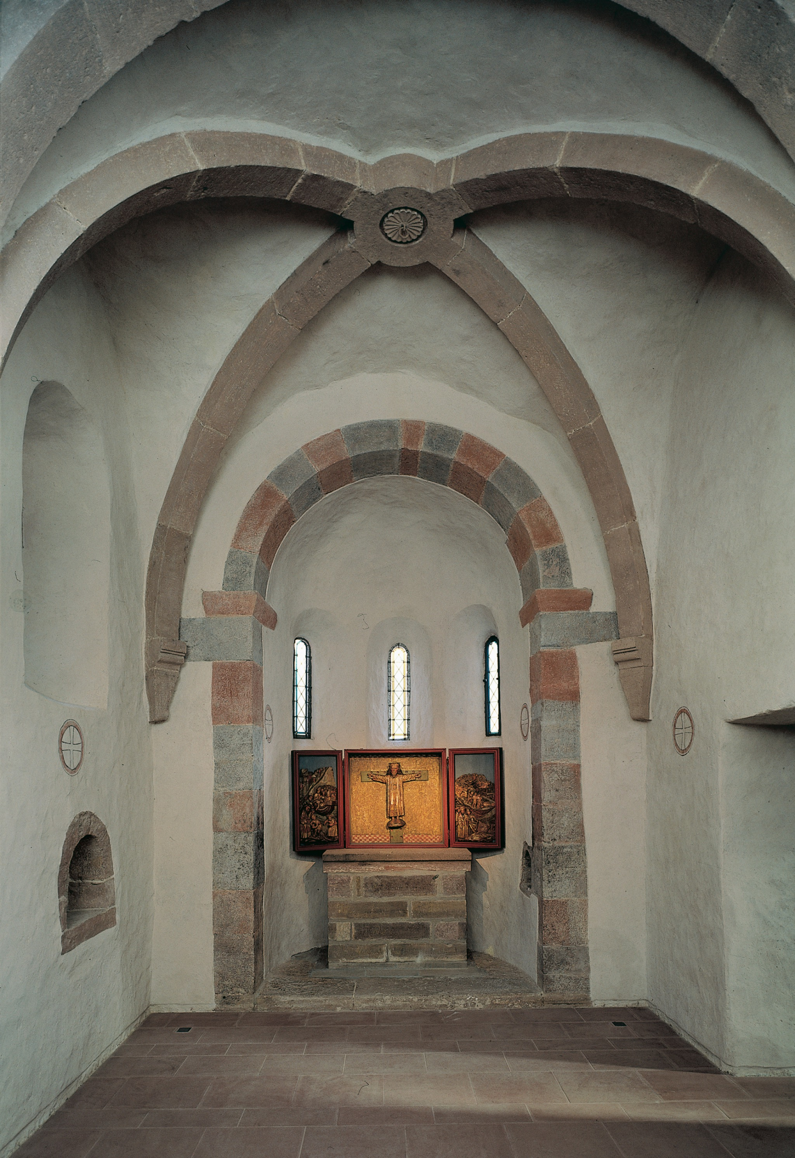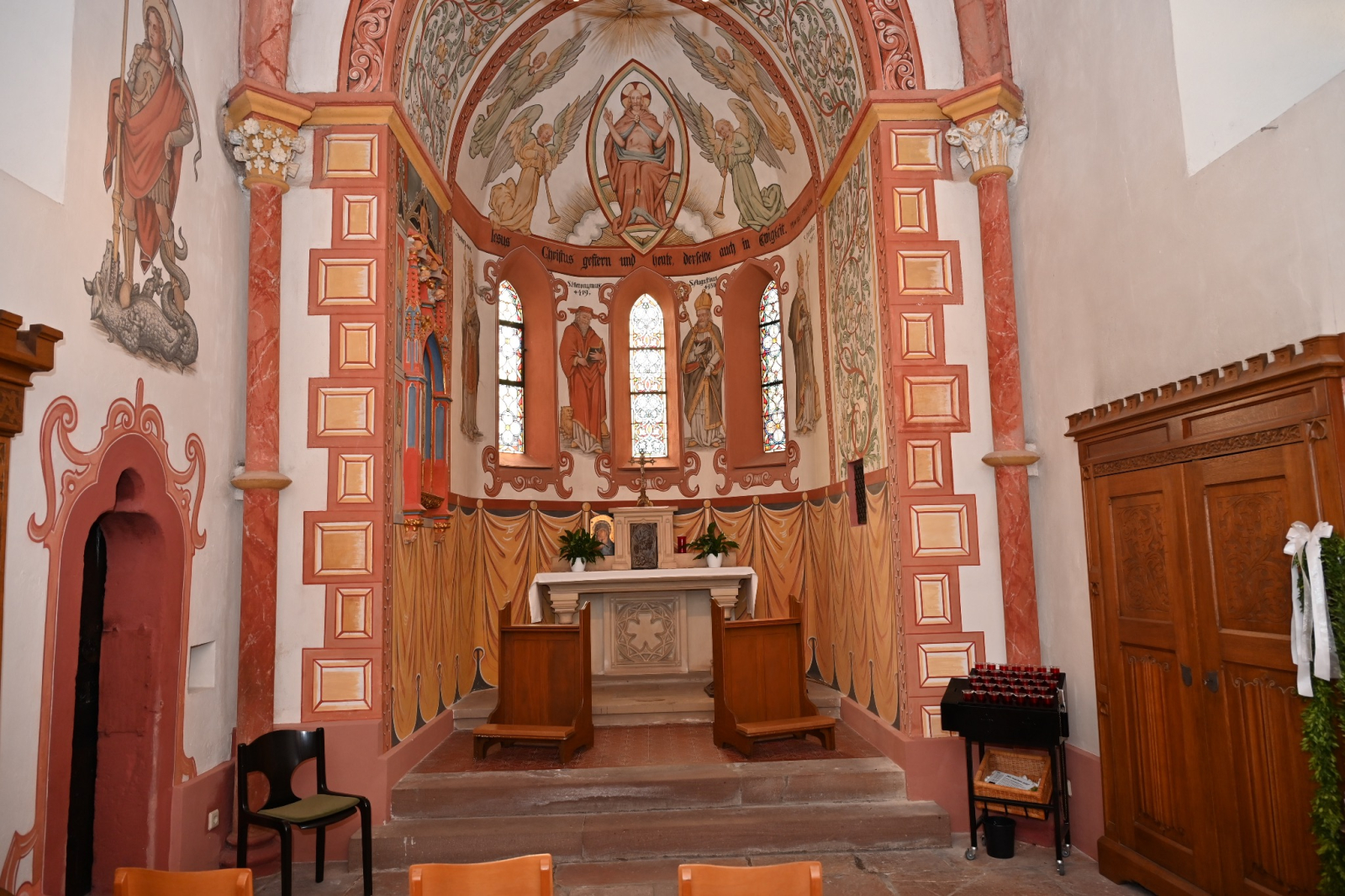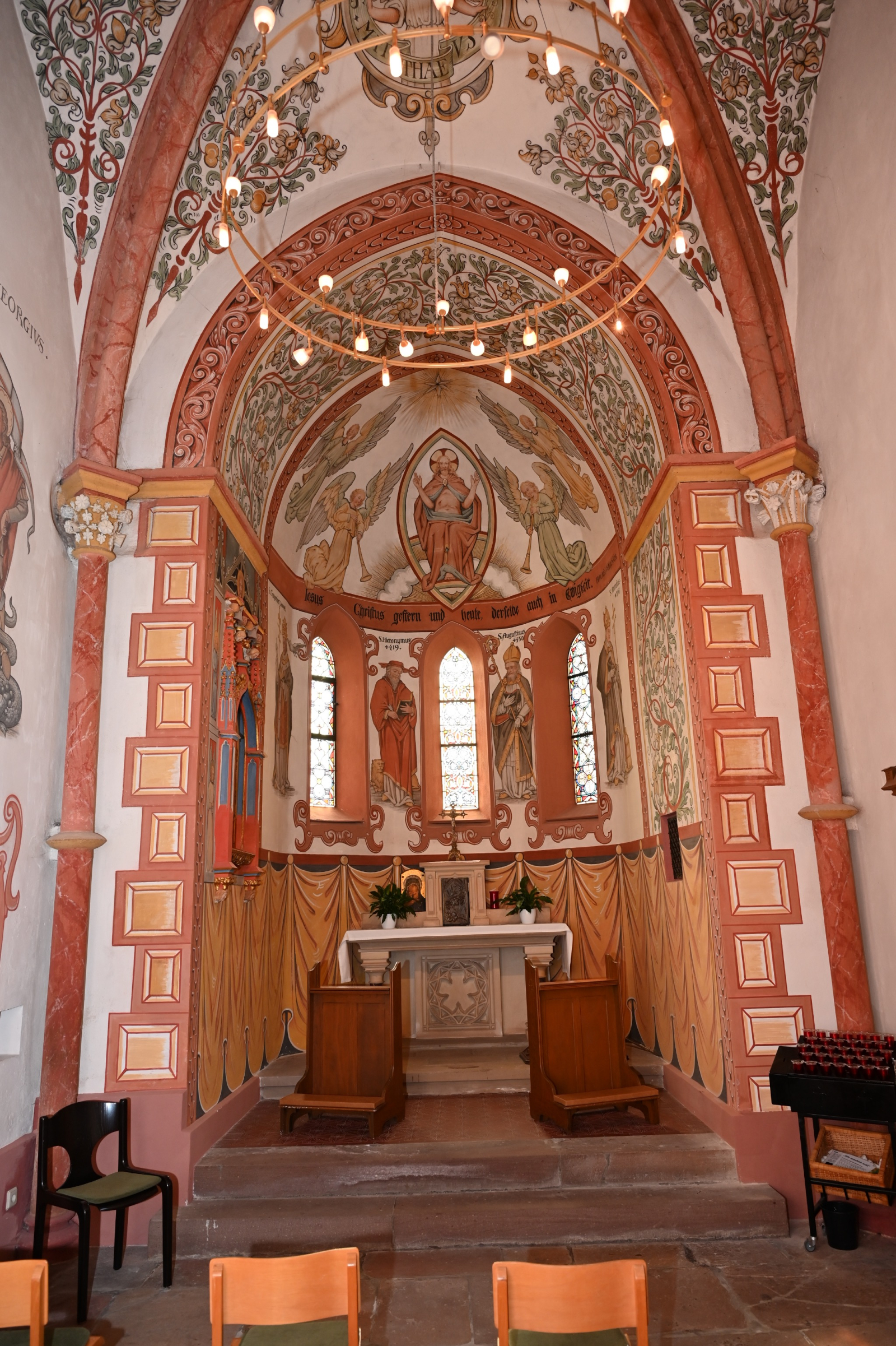 Im Gewölbe der Apsis thront Christus, von Engeln umgeben. Die Chorwand ist mit den Bildern von vier Kirchenlehrern (Stiftungen), mit Rankenwerk und einem Teppichbehang ausgemalt. In der Nordwand ist ein spätgotisches Sakramentenhäuschen (um 1500) eingebaut.