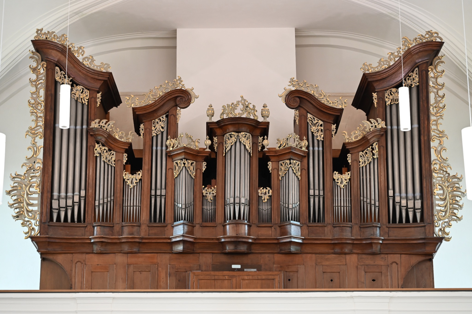 Die Orgelempore an der Westseite ruht auf einem Gewölbe mit drei Korbbögen. Das Schnitzwerk des Orgelprospektes schuf der Lehrer Joh. Anton Schön aus Maberzell. Das Orgelwerk mit seinen 24 Registern stammt von dem Bimbacher Orgelbauer Joh. Markus Oestreich.