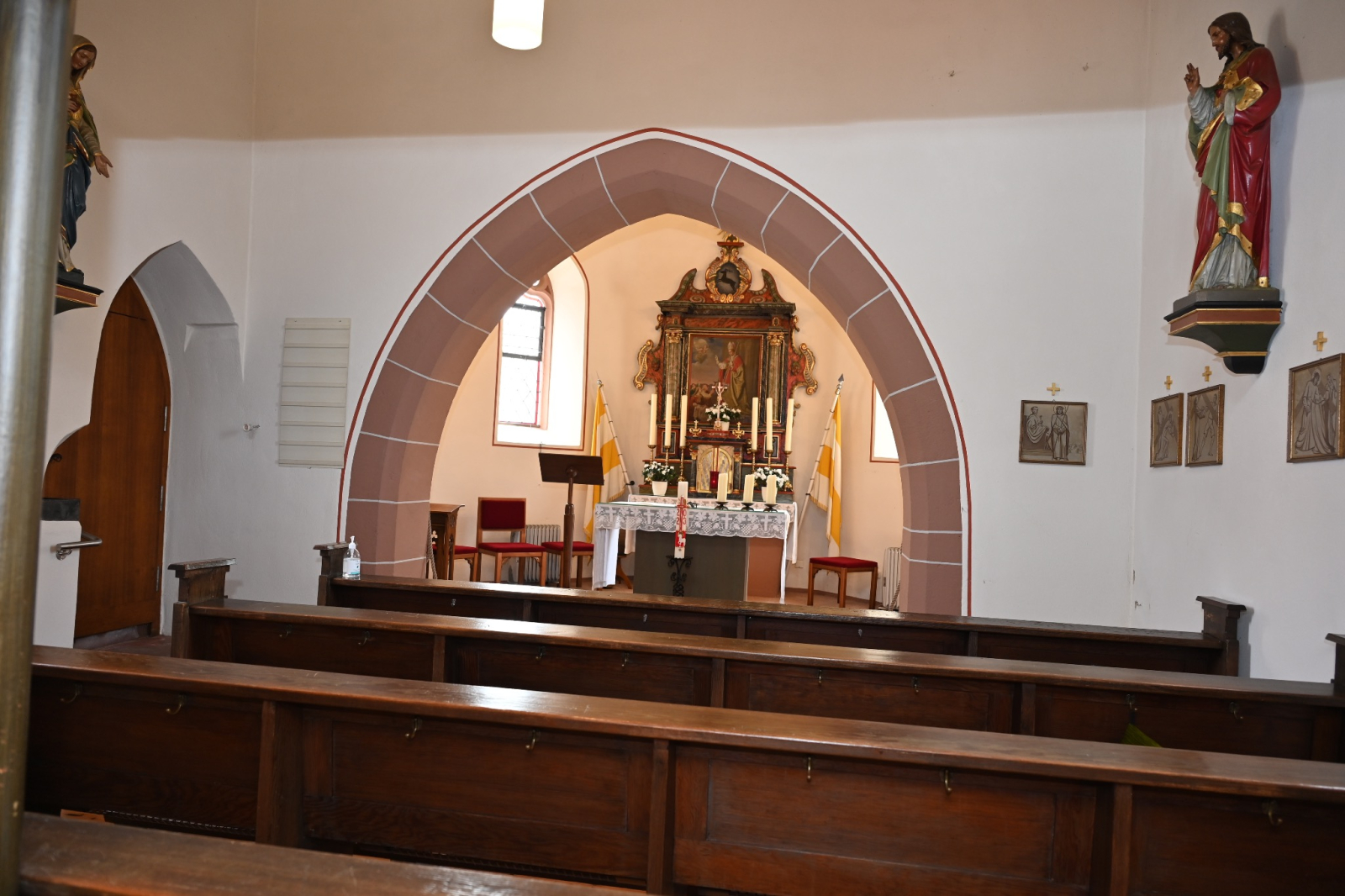 Der Innenraum hat eine einfache Holztonnendecke und einen breiten gedrückten Chorbogen. Der Altar zeigt im Altarblatt, das 1817 von J. Peter Weber gemalt wurde, die hl. Maria mit den Vierzehn Nothelfern. Im Auszug befindet sich ein Bild von Gott Vater. Die Empore ist mit barocken Ölbildern aus dem Marienleben versehen. Früher zum Altar gehörende Schnitzarbeiten hängen über dem Chorbogen.