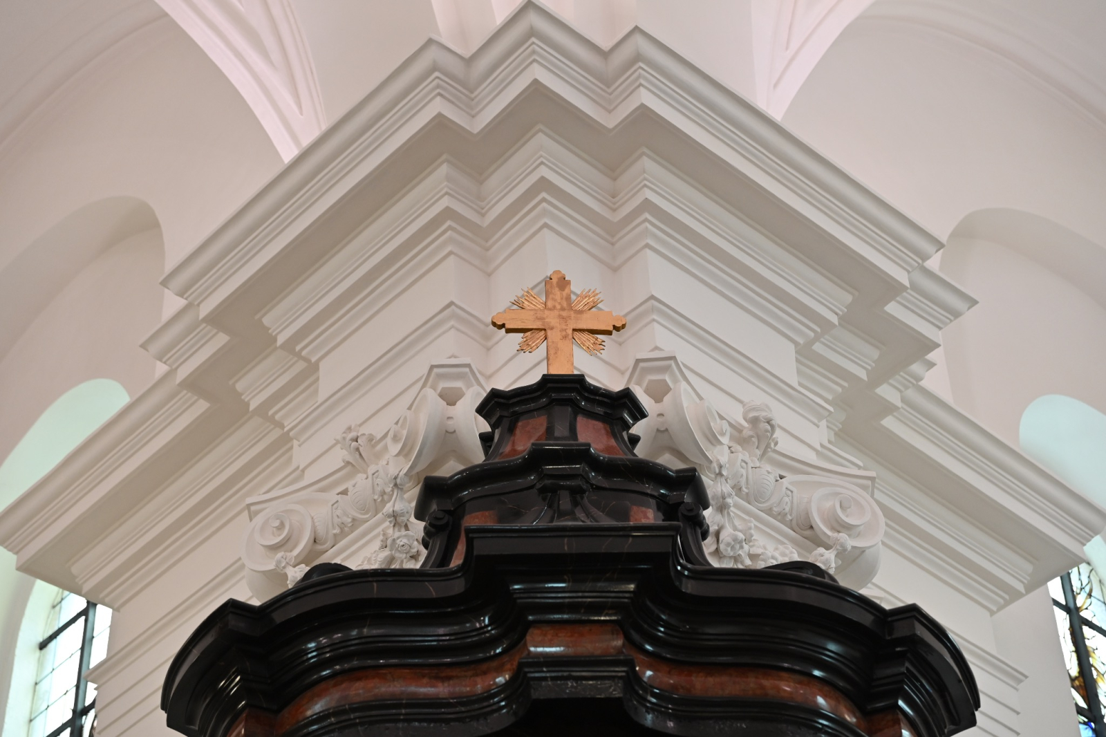 Die acht Zwickfelder tragen ornametales Rankenwerk. Die Rundstabrippen ruhen auf freistehenden Säulen, die von Schaftringen unterteilt sind und auf Eckblattbasen mit reich verzierten Kelchblattkapitellen stehen.